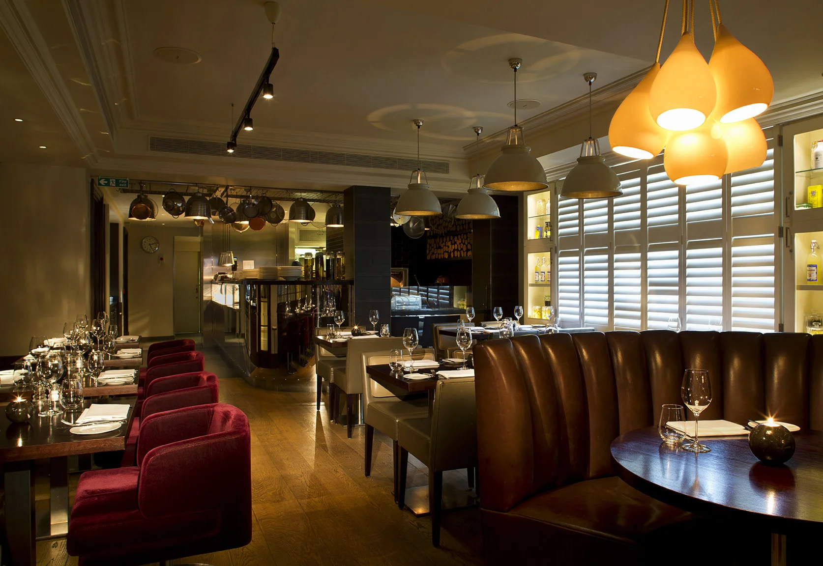 The restaurant itself also boasts comfortable armchair like seating all soft to the touch in a shade of claret as well as more traditional hard backed dining chairs, in a palette of deep stained wood and leather (look), juxtaposed with cream coloured walls and lamp shades with clean lines in part created by the open kitchen at the foot of the dining area.