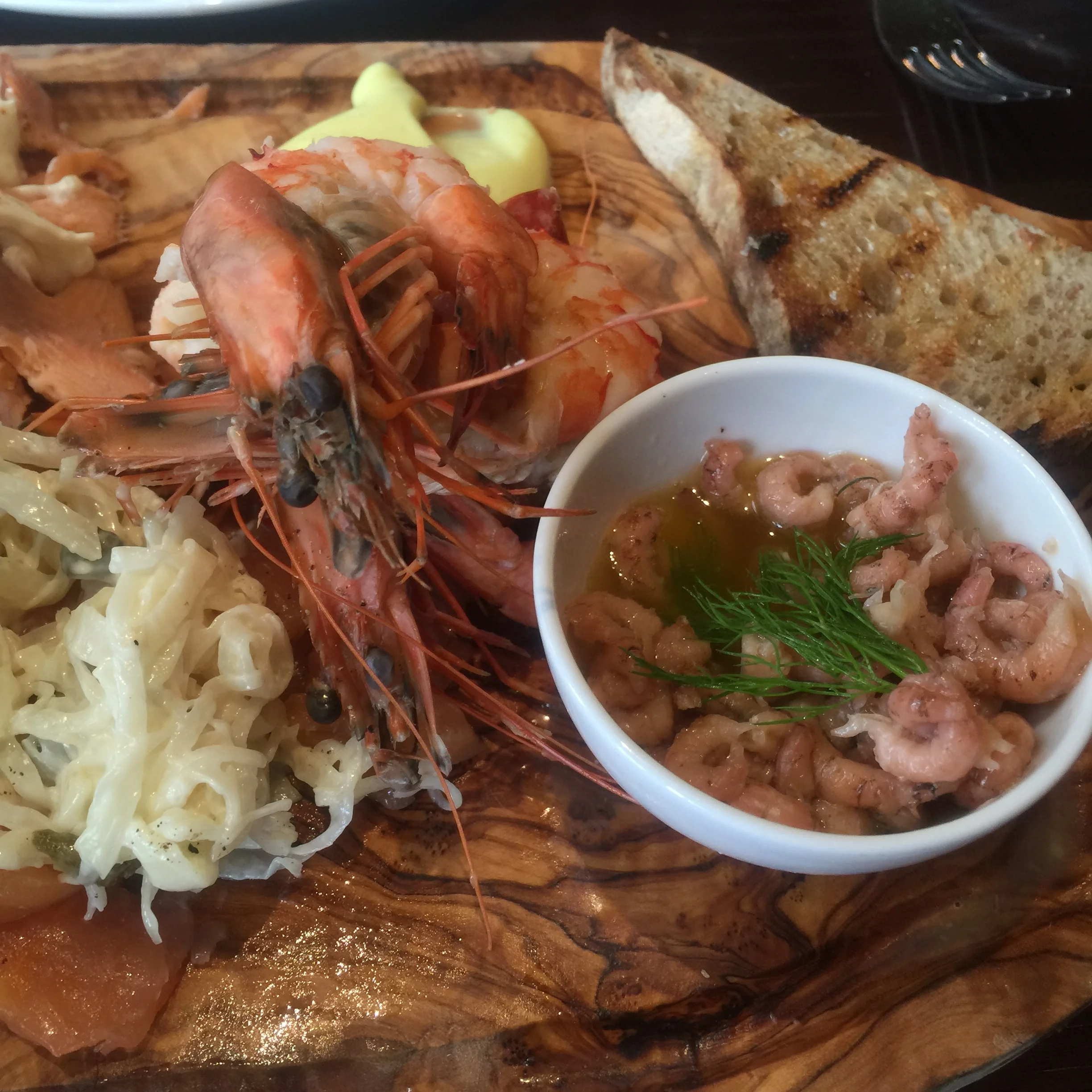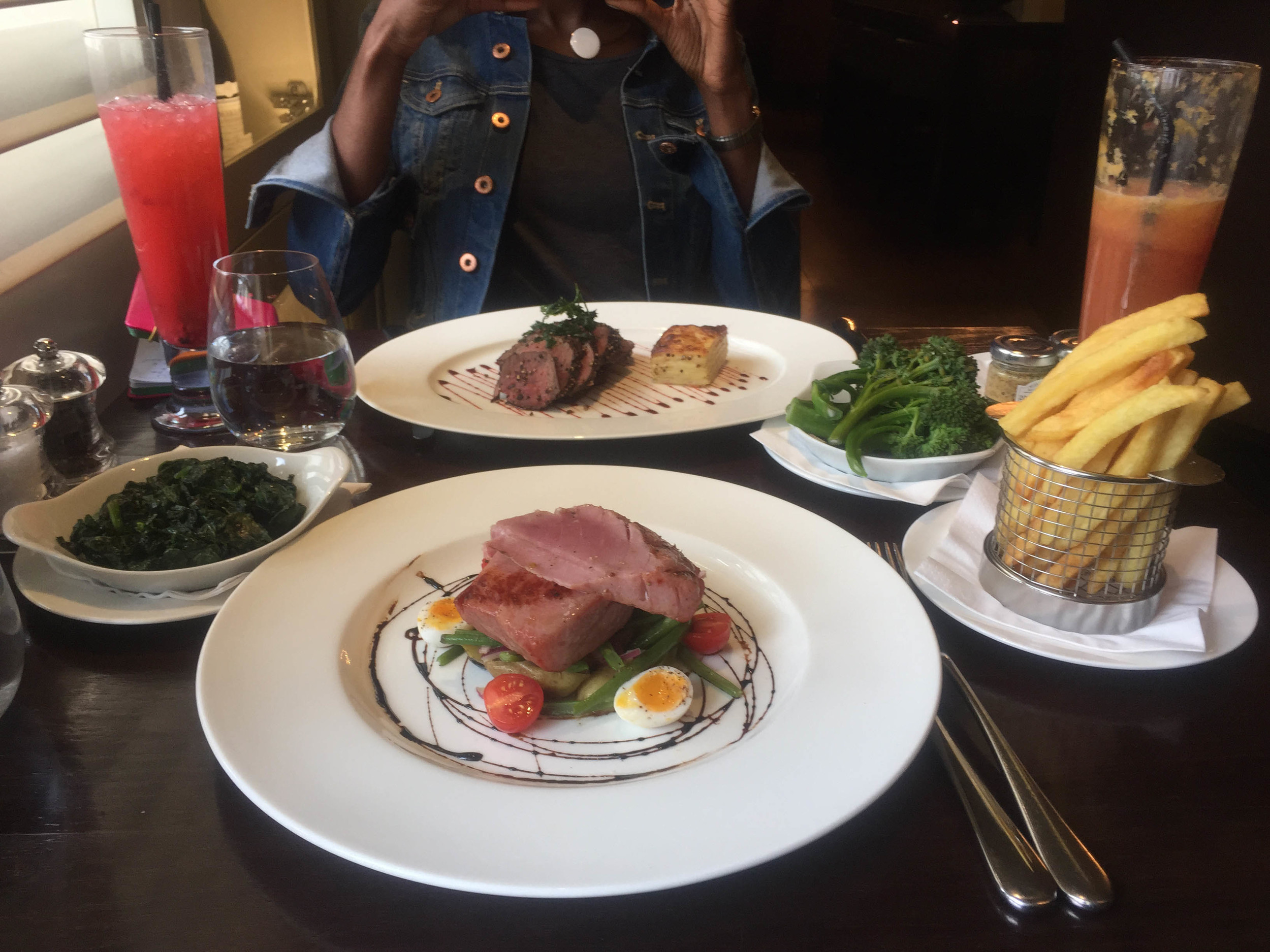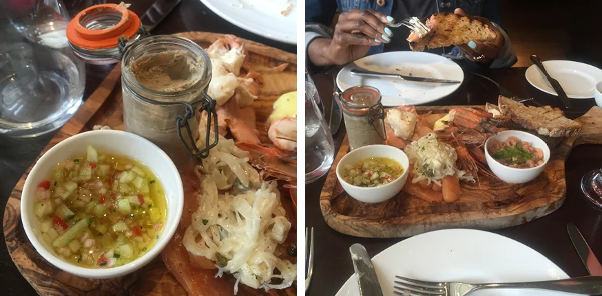 AfroNoire EiC Deborah Marie was my dining partner for the afternoon shared the fish board with me to start. We were presented with an abundance of delights which included potted shrimps, smoked trout, cured salmon, prawns and a mango salsa and other accompanying dressings. The portion size was generous and each morsel mouth watering-ly good.