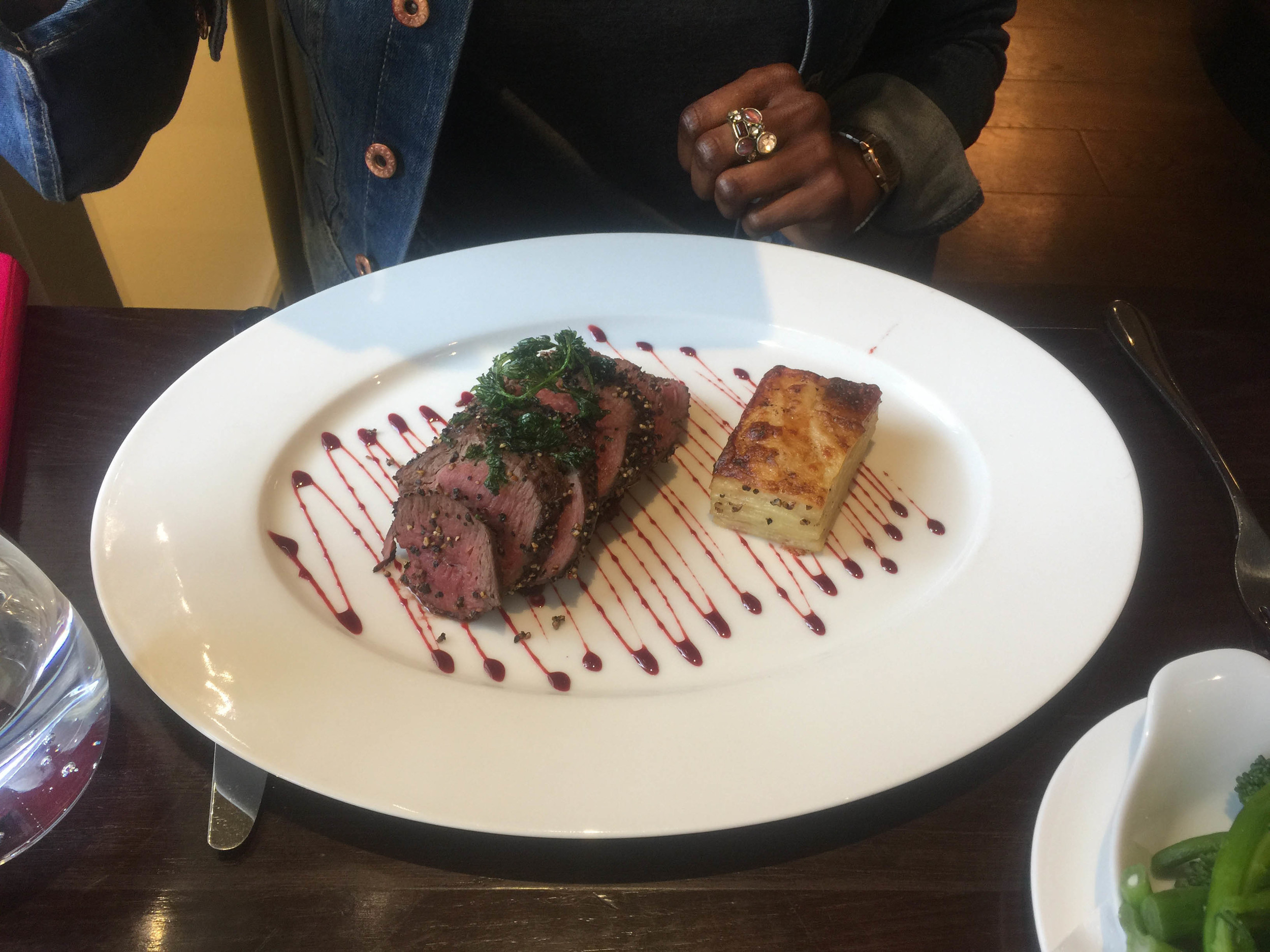 For my main meal I tried loin of venison for the first time which I’d describe as both lamb and game like, cooked so as still pink, peppered lavishly and it melted in my mouth. The liberal loin of venison was accompanied by a modest sized gratin all potato, turnip and creamy layers finished off with an oven created crunch. It was served on top of a beetroot puree and jus both decorating the plate and providing a sauce to bring it all together. I added broccoli as a side and the combination of fresh greens with tender meat, cracked pepper, subtle cream from the gratin with a hint of sweet and sour from the beetroot made for the ultimate mouthful. I was suitably impressed.