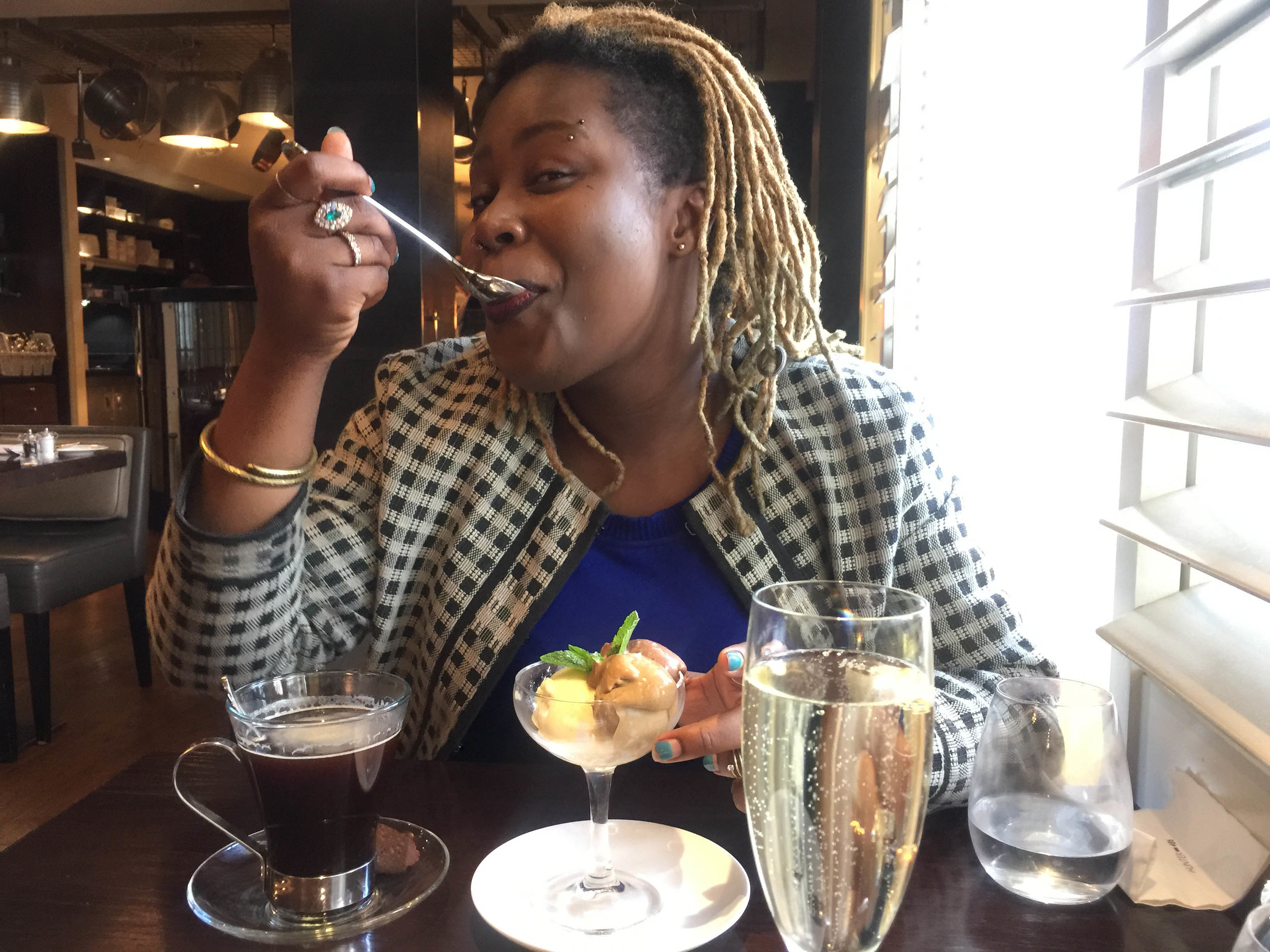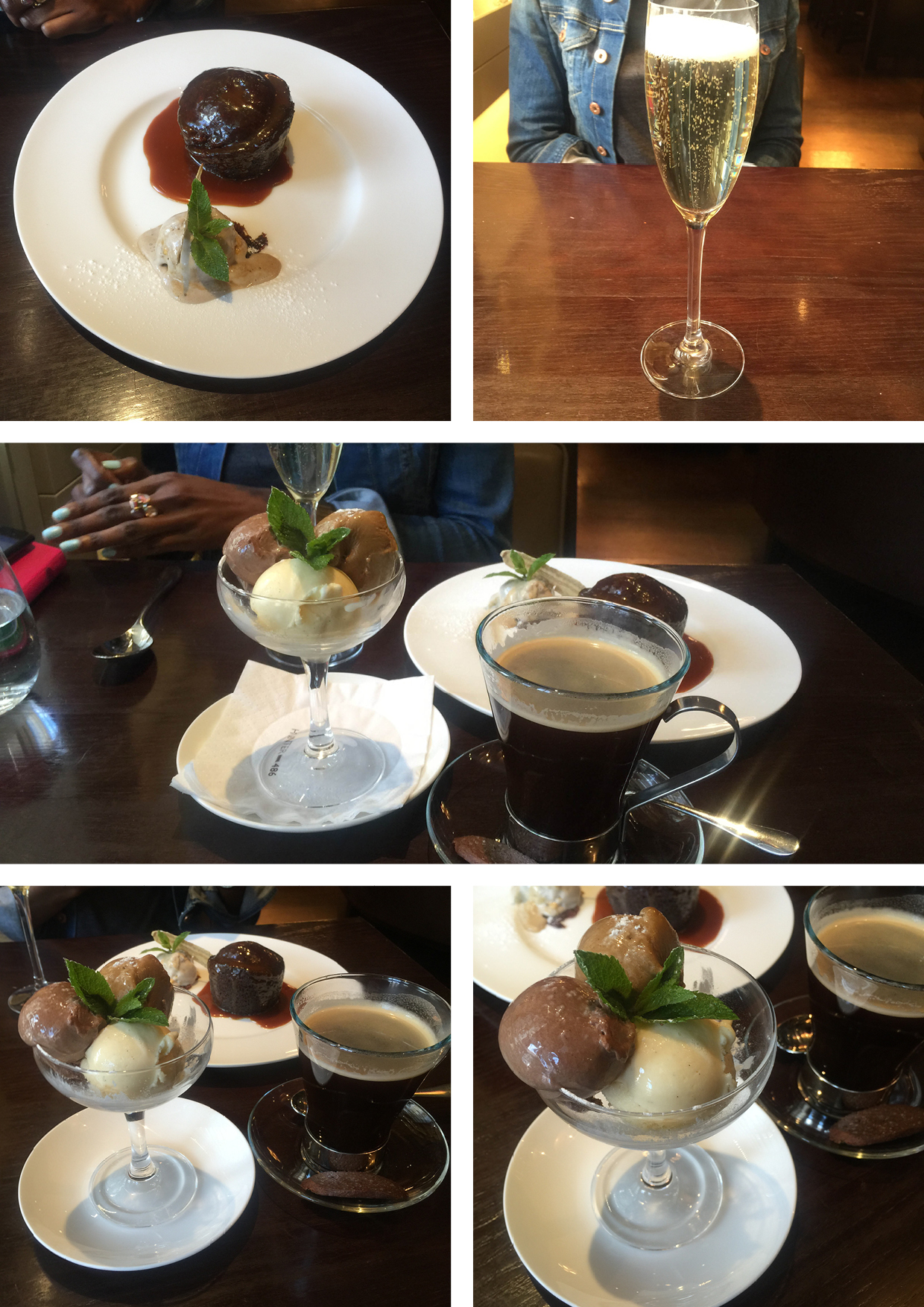 I rounded off my meal with a sticky toffee pudding served with a caramelised banana slice, toffee sauce and ice cream. The pudding itself was not overly sweet, which meant that the toffee sauce could be and was thick and rich. There was a hint of bitterness from caramelised crumbs which were like a hidden gem beneath the creamiest of ice creams, even the decorative mint added to the splendour of this dish. I washed this all down with a glass of Prosecco which totally hit the spot while Deborah Marie opted for the trio of ice creams each scoop all glossy and glorious.